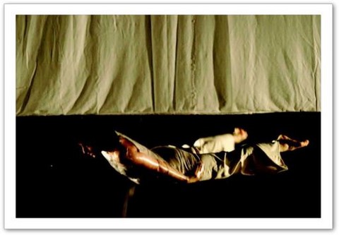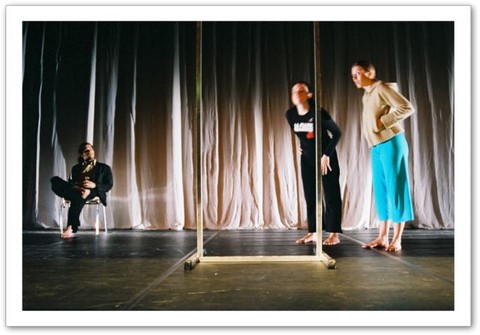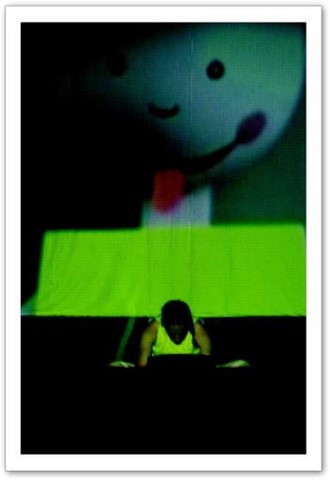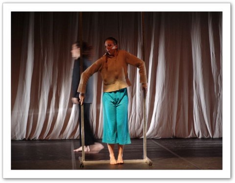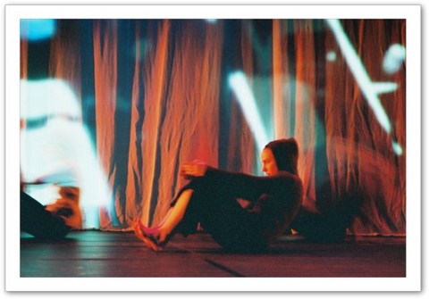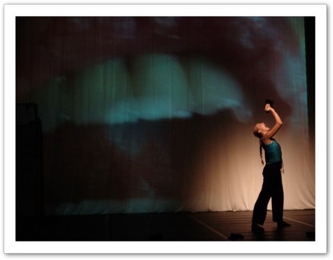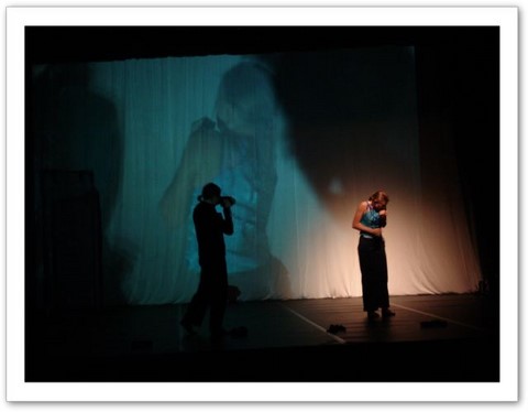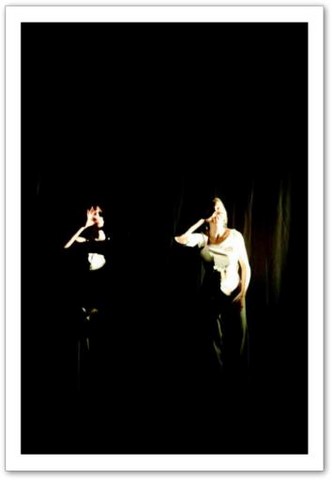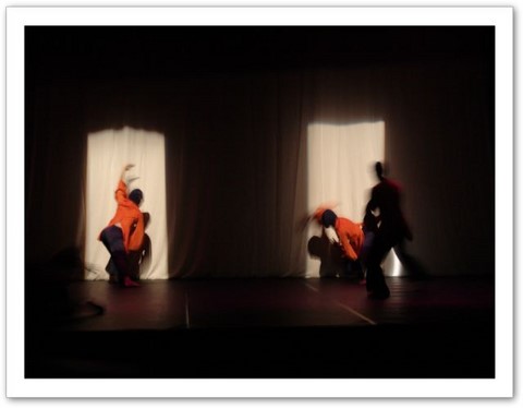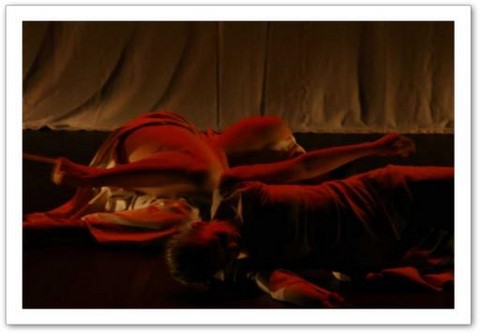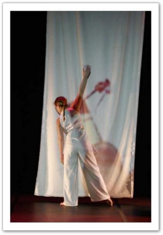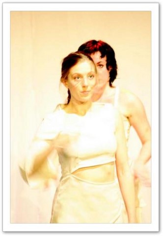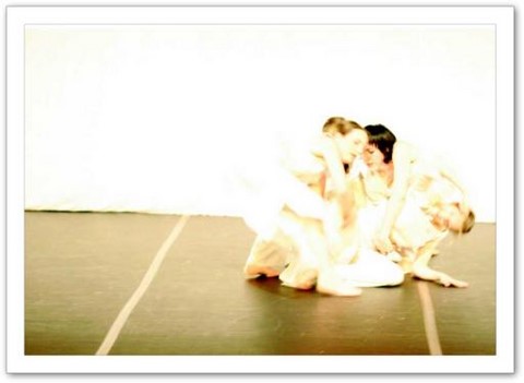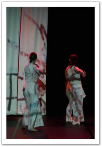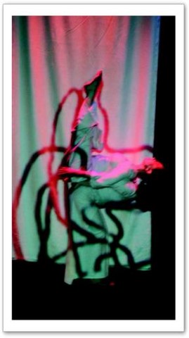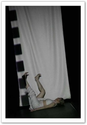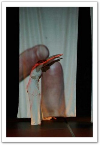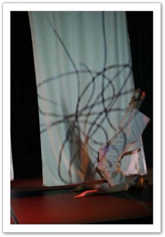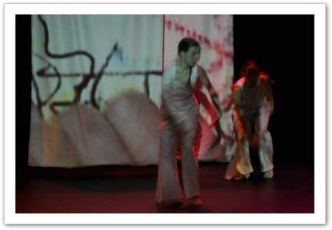 La projection : Par petites touches, la vidéo renforce l'atmosphère exprimée sur scène. Les danseurs sont en jeux total avec elle. Par un travail de graphisme en live, les corps sont manipulés par le vidéaste qui les dessinent tel un peintre qui crée son oeuvre en la structurant et la destructurant.